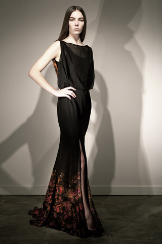 Designer, Erdem Moralioglu showcased his first ever pre-fall 2011 collection in London a little over a week ago. Moralioglu said of his collection, "I was thinking more about a woman this time. The prints I developed from fireworks, a kind of fifties wallpaper pattern, and a weird picture of a garden I took on my Blackberry." Other common styles included knee-length dresses, lacing over silk, and a lot of structured silk faile fabric used. Also, more included than ever were separates. Take a look below at some of the designs.